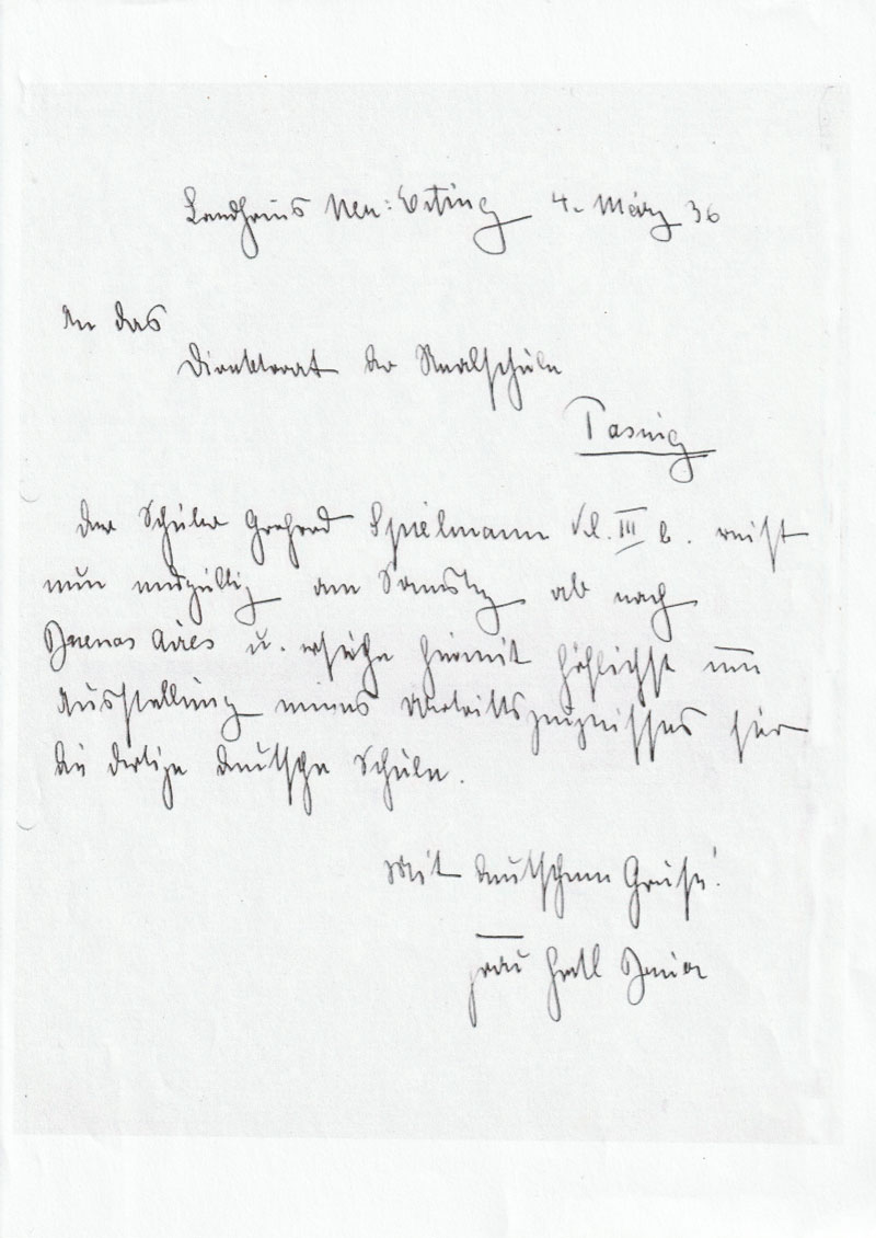 Der Schüler Gerhard Spielmann Kl. III b. reist nun endgültig am Samstag ab nach Buenos Aires und ersuche hiermit höflichst um Ausstellung eines Übertrittszeugnisses für die dortige deutsche Schule.