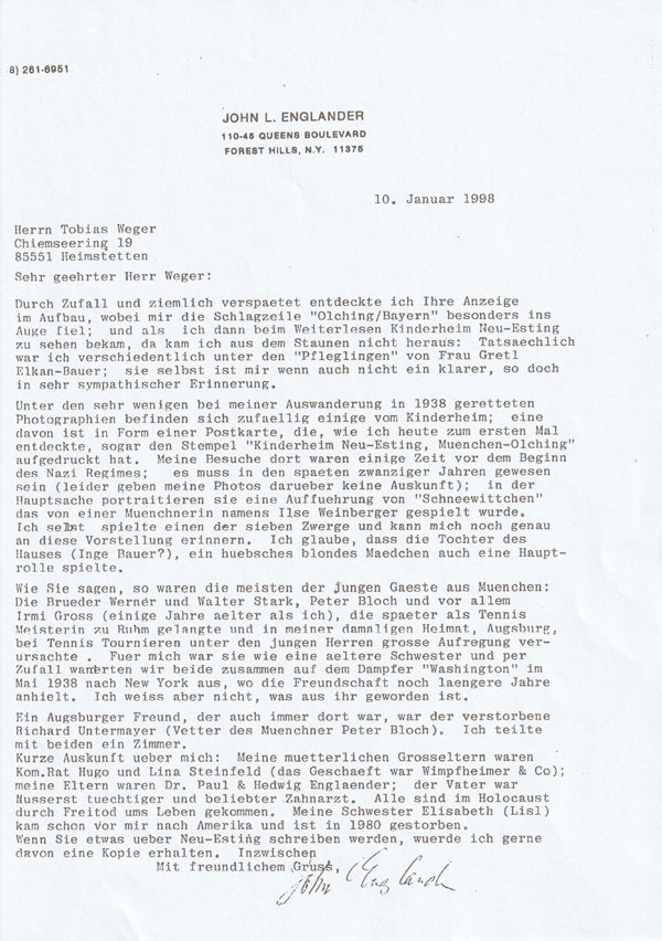 Ein Brief von John L. Englander vom 10. Januar 1998 aus New York, der sich darin an seine unbeschwerten Sommerferien-Aufenthalte in Neu-Esting Ende der 20-er Jahre erinnert. Davon zeugen die nebenstehenden Fotos, die er im Exil aufbewahrt und mitgeschickt hat.